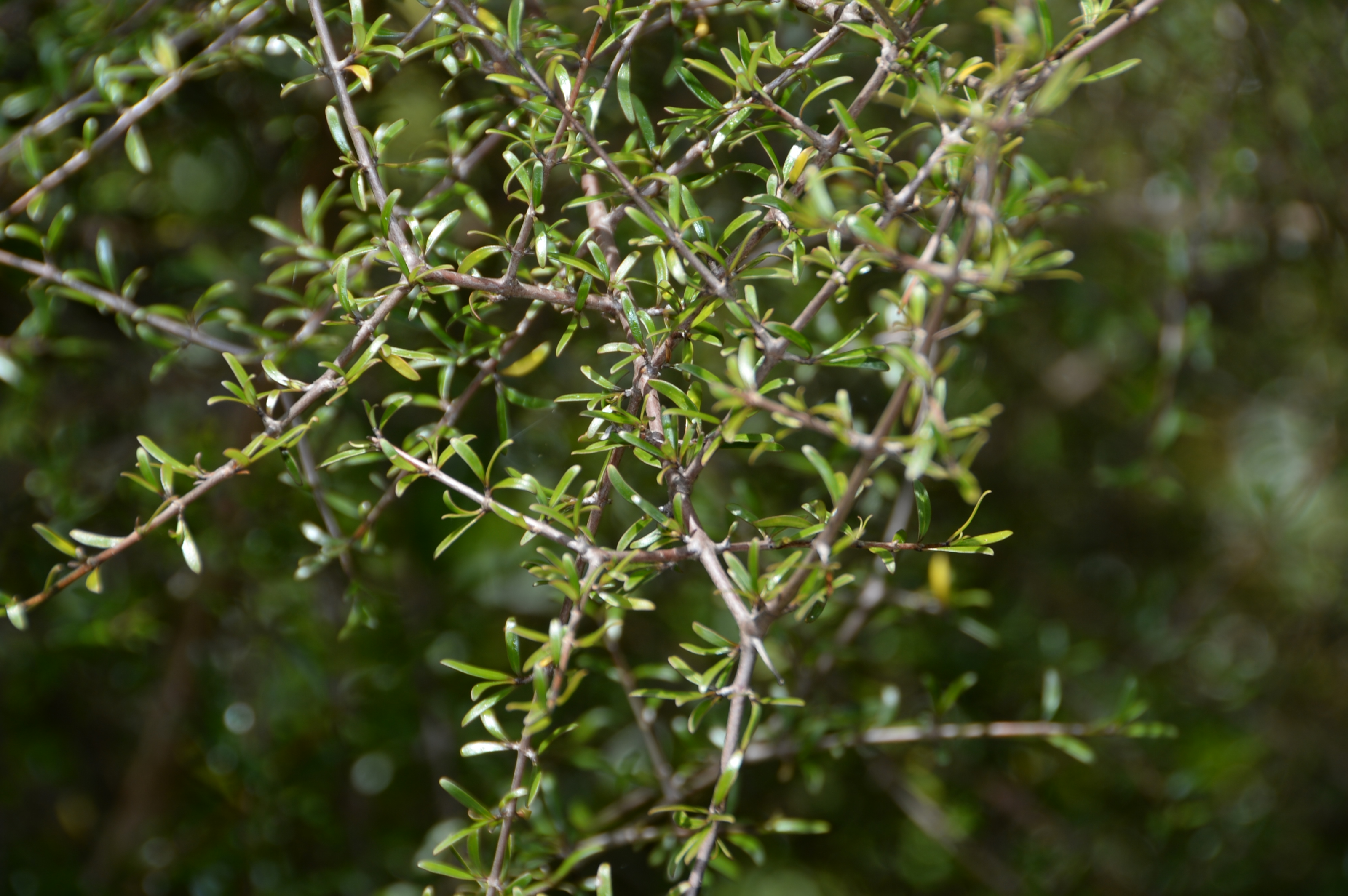 3. (noun) broad-leaved mingimingi, Leucopogon fasciculatus, Coprosma propinqua var. propinqua and prickly mingimingi, Leptecophylla juniperina subsp. juniperina - native shrubs with small, narrow leaves which alternate or are in tufts, prickly to touch. Fruit is red, pink, blue or white and the bark is black.
